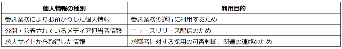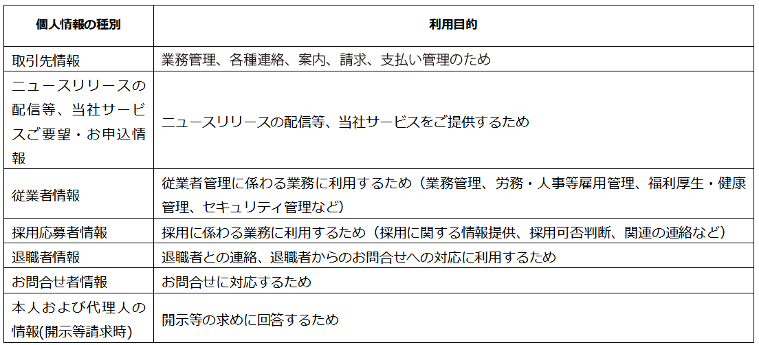 当社が事業活動において取扱う個人情報の利用目的は、次の通りです。