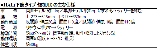 CYBERDYNE社では「ロボットスーツHAL」(HAL:Hybrid Assistive Limb)をシリーズ化しており、全身タイプから、腕、膝、手、指といった個別の部位ごとにも開発を進めている。現行の下肢タイプ・福祉用は昨秋から本格的にレンタルでの提供を開始した。