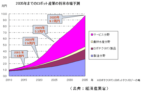 経済産業省と独立行政法人新エネルギー・産業技術総合開発機構(NEDO=ネド)が2010年4月に公表した予測データによると、ロボット市場(国内生産量)は2020年に2.9兆円、2025年に5.3兆円、2035年には9.7兆円にまで成長する。