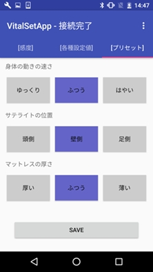 また、バイタルセンサーは使用前に各種パラメータの設定が必要ですが、複数のプリセット条件(対象者の動きのはやさ、サテライトセンサーの設置位置、マットレスの厚さ等)が用意されており、使用条件に合わせてスマートフォンアプリで簡単に調節できます。